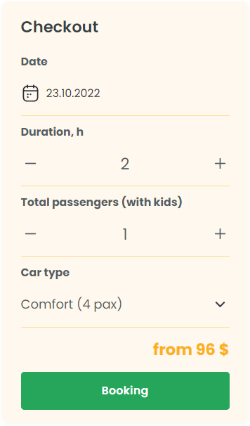 On the page that opens, you can read more about the service and will need to fill out a short order form. Specify the date and rental period, the number of passengers, a desired car class and meeting point with the driver.