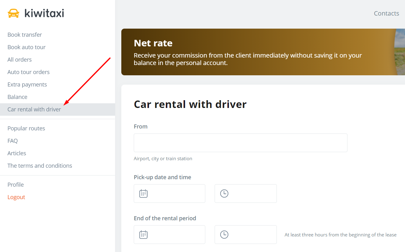 The first one hasn't changed much. To get started, you need to go to your personal account and click on the "Car rental with driver" in the menu on the left.