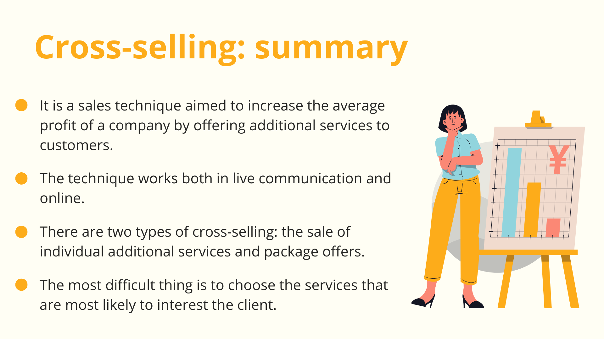 Its philosophy is to solve a customer's problem by offering them even more value from a new acquisition. Using this technique, salespeople gently lead customers to the opportunity to purchase related products to those already purchased.